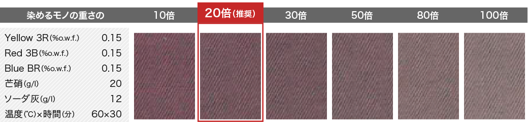 お湯の量を変えた場合の染色後の色見本になります。OWNLY ONEは被染物の20倍の湯量をベースにしています。